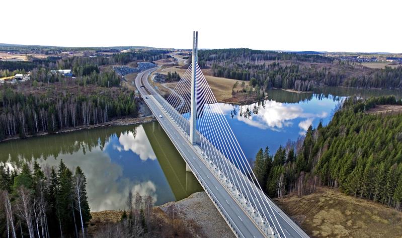 The bridge is 315 metres, and the tip of the tower rises 88 meters above the water level in the Glomma, Norway's longest river, which flows under. E18 goes over the bridge with 4-lane motorway bridge. The bridge is a very special sight, with 14 inclined cables on each side of the large tower. This gives the bridge its characteristic harp shape.
